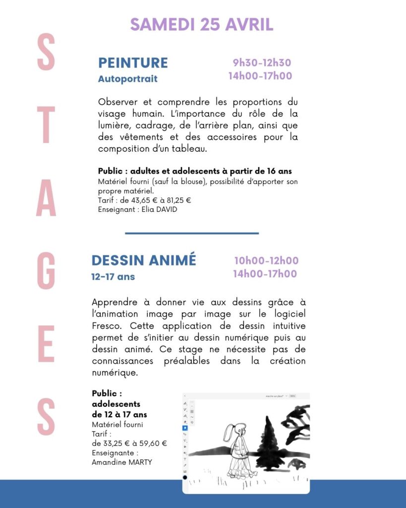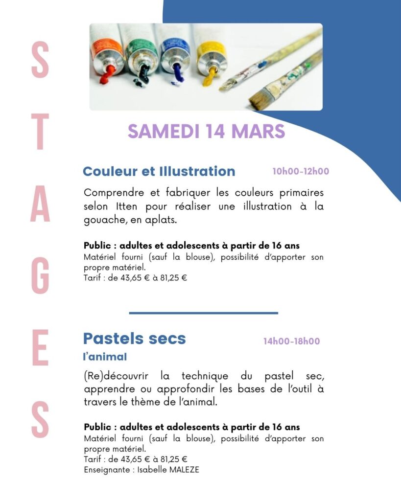 une offre pluridisciplinaire (peinture, illustration, pastels, modelage, arts numériques…) pour petits et grands !